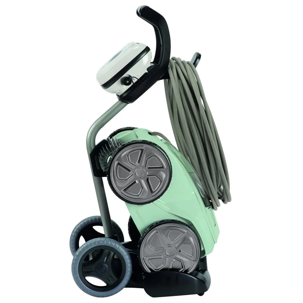 Robot je vybaven patentovaným zvedacím systémem, který ho automaticky navede ke stěně a vypustí vodu před vytažením. Součástí balení je také transportní vozík, který usnadňuje přesuny i bezpečné uložení.