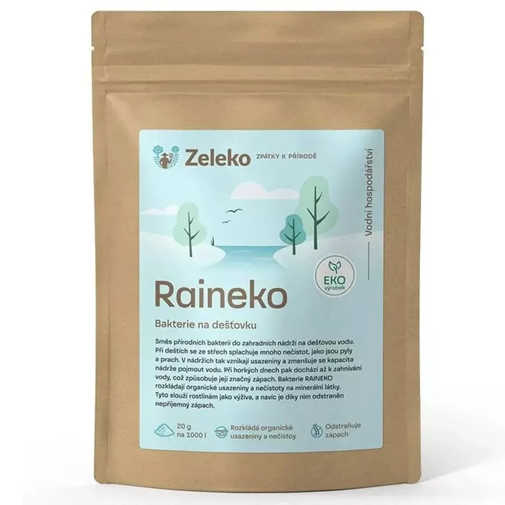 RAINEKO je přírodní směs bakterií určená pro zahradní nádrže na dešťovou vodu. Při deštích se na střechách usazují nečistoty, které se splachují do nádrží. Tyto usazeniny snižují kapacitu nádrže a při vyšších teplotách mohou vést ke zhoršení kvality vody a vzniku nepříjemného zápachu. Bakterie RAINEKO efektivně rozkládají organické nečistoty a přeměňují je na minerální látky, které slouží rostlinám jako živiny. Díky tomu zajišťují čistotu vody a eliminují nežádoucí zápach.
