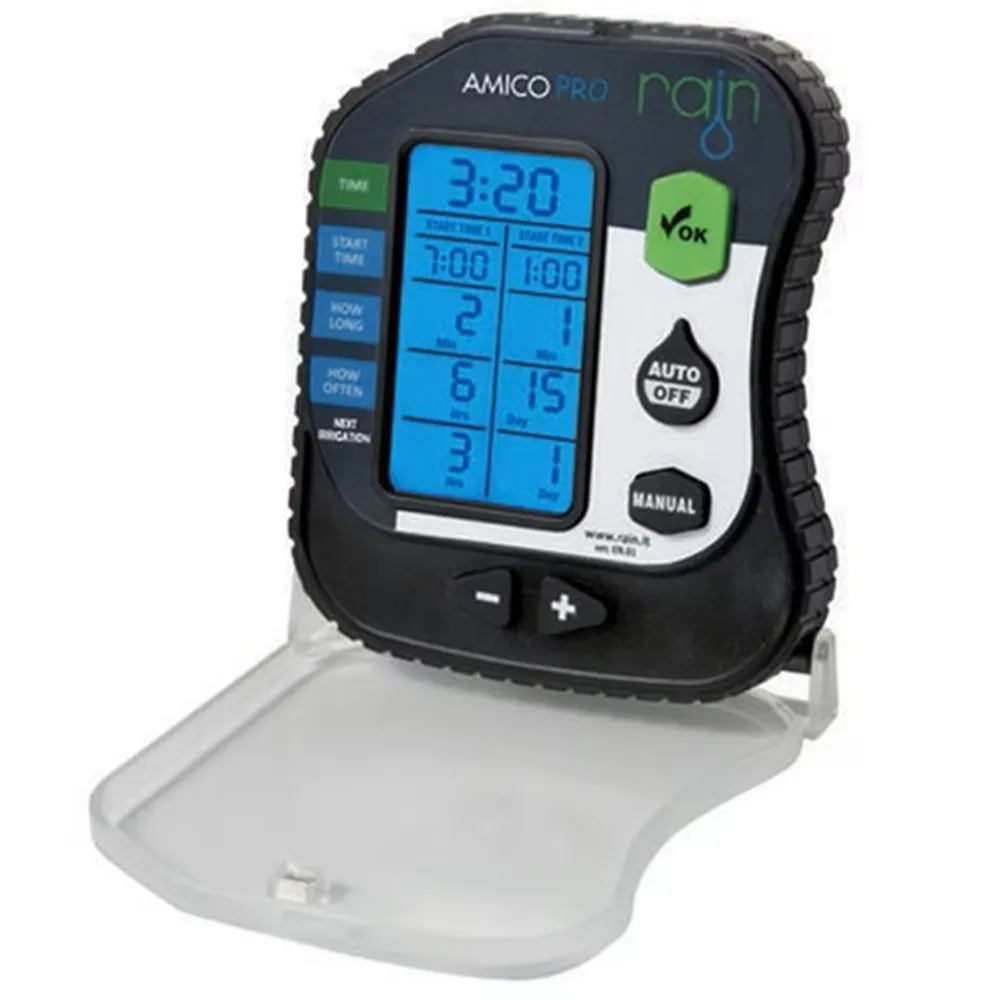 Rain Amico PRO je bateriová řídicí jednotka s krytím IP68 určená pro zavlažování dvou sekcí. Díky vodotěsné konstrukci je vhodná pro instalaci přímo do ventilových šachet, kde spolehlivě odolá vlhkosti i náročným venkovním podmínkám.