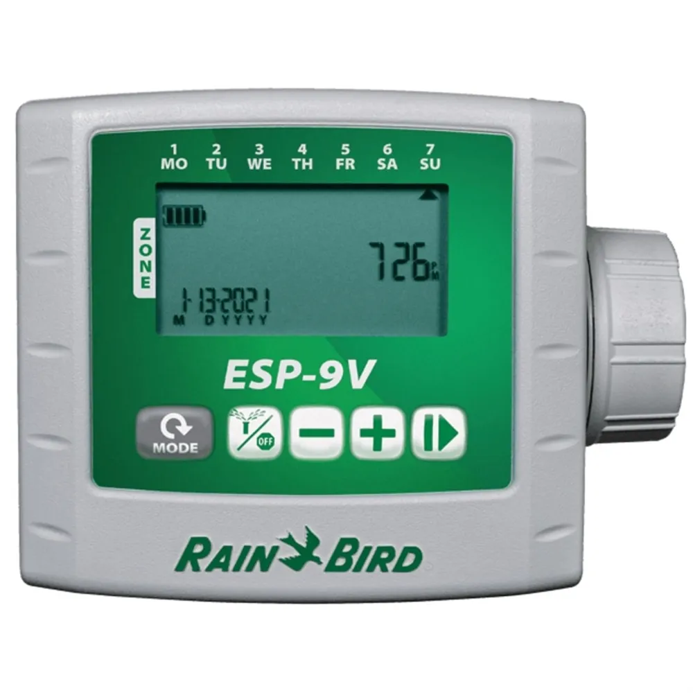 Rain Bird ESP-9V-2 je bateriová řídicí jednotka navržená pro automatické zavlažování tam, kde není dostupný přívod elektřiny. Ovládá dvě sekce a nabízí snadné tříkrokové programování přes velký LCD displej s intuitivními ikonami. Využití najde jak pro zavlažování menších zahrad, skleníků, trávníků, tak i pro kapkovou závlahu.