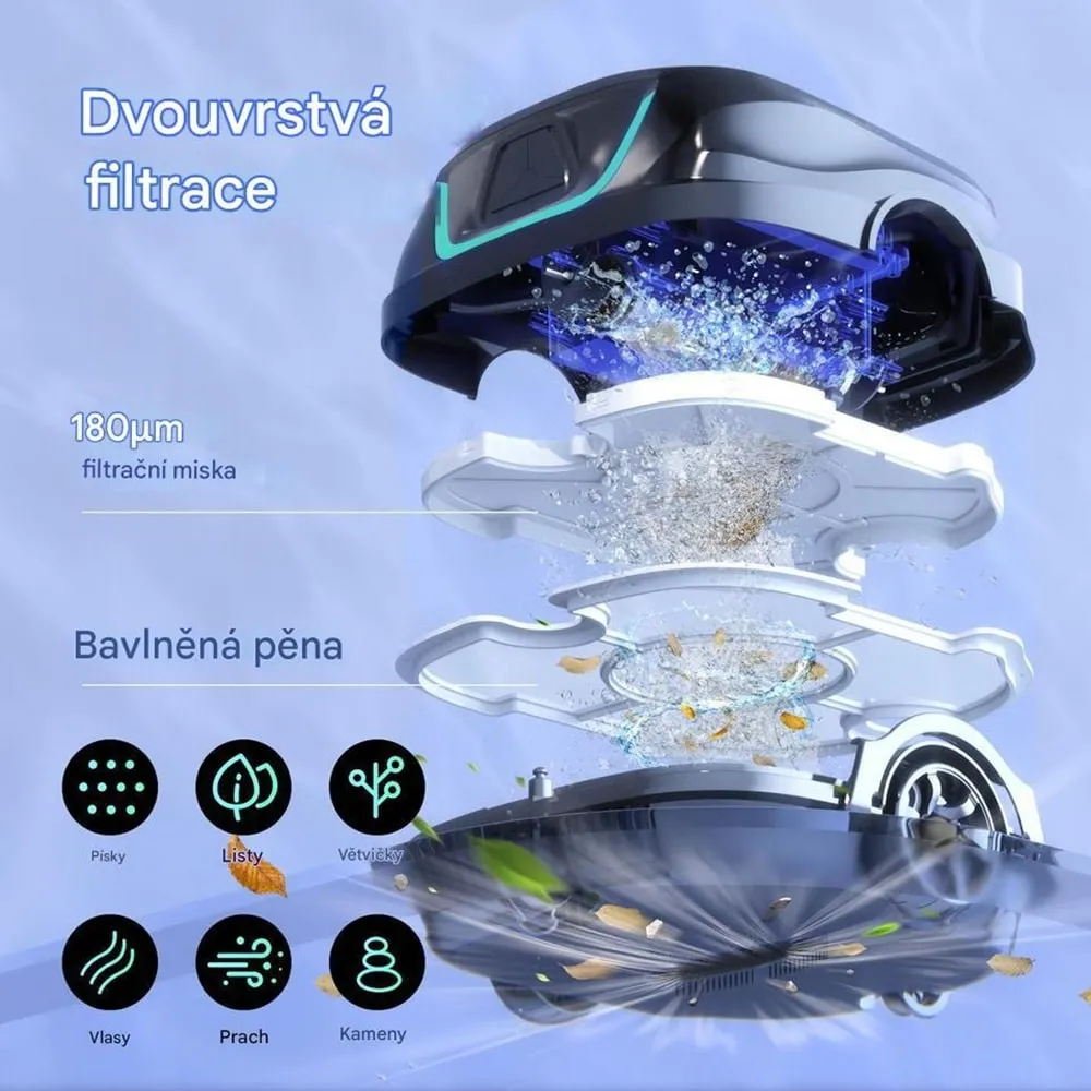 Na rozdíl od běžných bazénových robotů s jedním filtračním košem je WYBOT A1 vybaven dvouvrstvým filtračním systémem – jemnou síťkou o hustotě 180 μm a bavlněnou pěnovou filtrací, která díky 70% nárůstu filtrační plochy výrazně zvyšuje celkovou účinnost. Nečistoty jsou zachycovány ve vyjímatelném filtračním tácku, což zajišťuje účinné odstranění písku, listí i jemných nečistot a vyšší úroveň čistoty vody.