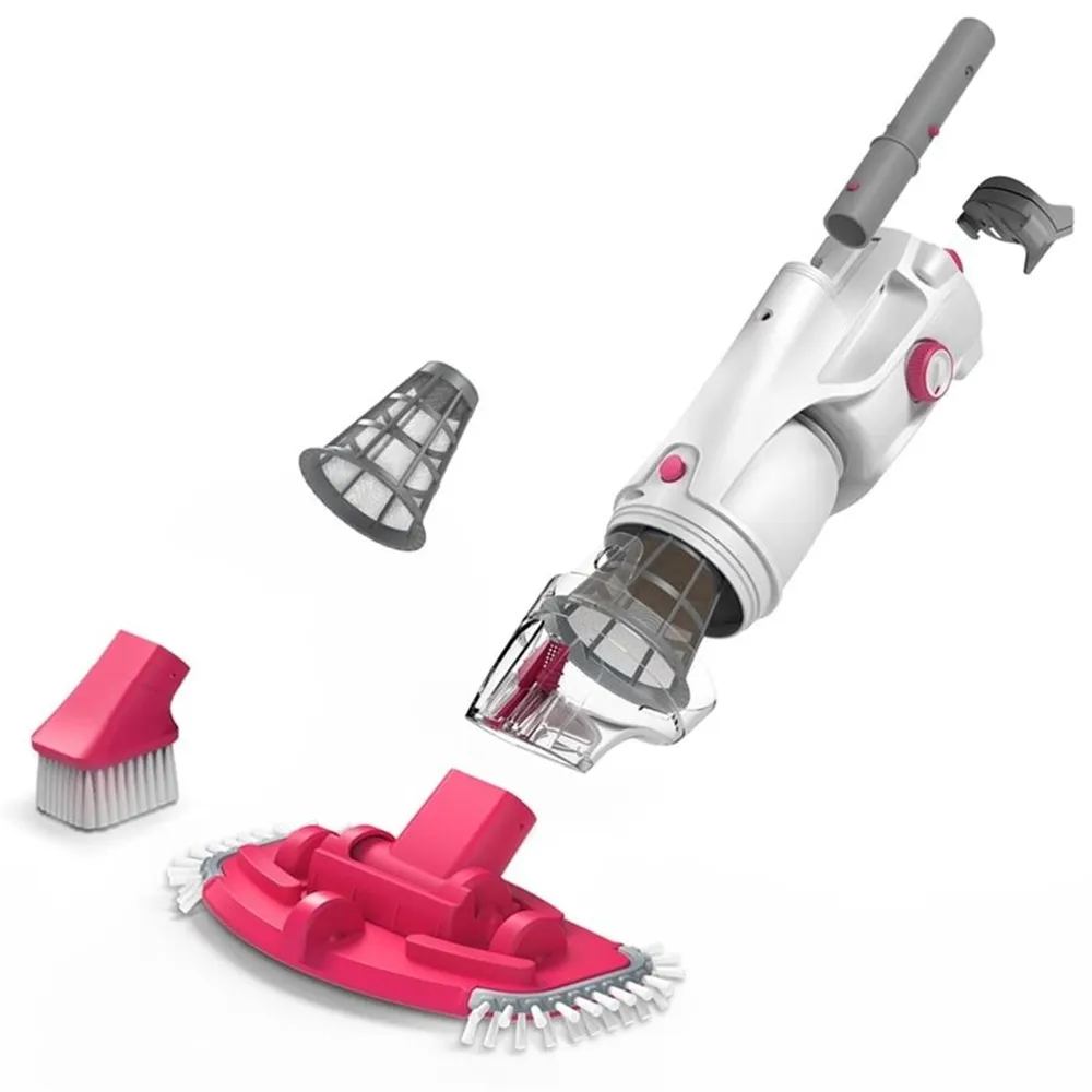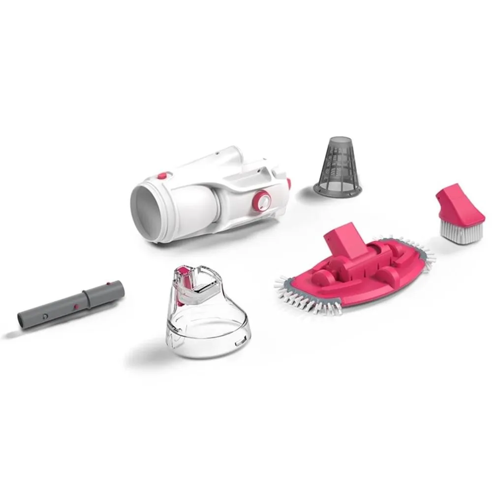 Nečistoty zachytí vnitřní filtrační koš se sítkem 250 µm. Součástí jsou dvě výměnné hubice – větší s kartáči a kolečky pro efektivní čištění dna, menší s kartáči po obvodu pro detailní dočištění. Nabíjení probíhá přes USB port, s indikací stavu baterie. Plné nabití za 4 – 6 hodin vystačí na až 30 minut provozu.