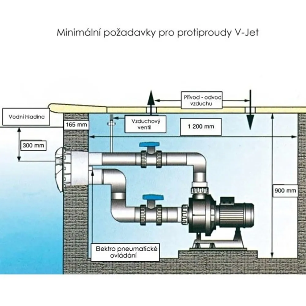 Vestavný protiproud V-JET je kompletní zařízení určené pro fóliové a předvyrobené bazény, které kombinuje výkonný tok vody s komfortní regulací. Díky trysce o průměru 40 mm s možností regulaci průtoku vody (vnitřní tryska) můžete upravit jak sílu proudu, tak množství přisávaného vzduchu (vnější tryska) přímo během koupání.
