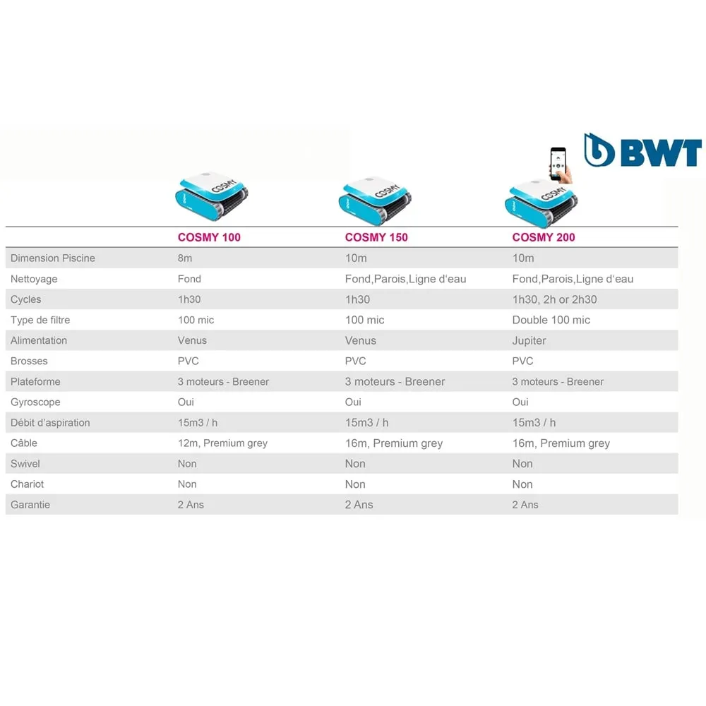 Kompaktní automatický vysavač BWT COSMY 150 je určen pro účinné čištění dna, stěn i hladinové linky v domácích bazénech do velikosti 10 x 5 m. Díky nízké hmotnosti, plochému designu a praktickému madlu je manipulace s vysavačem mimořádně snadná. Výkonný filtrační systém s horním přístupem zachytí nečistoty do velikosti 100 μm a přefiltruje až 15 m³ vody za hodinu.