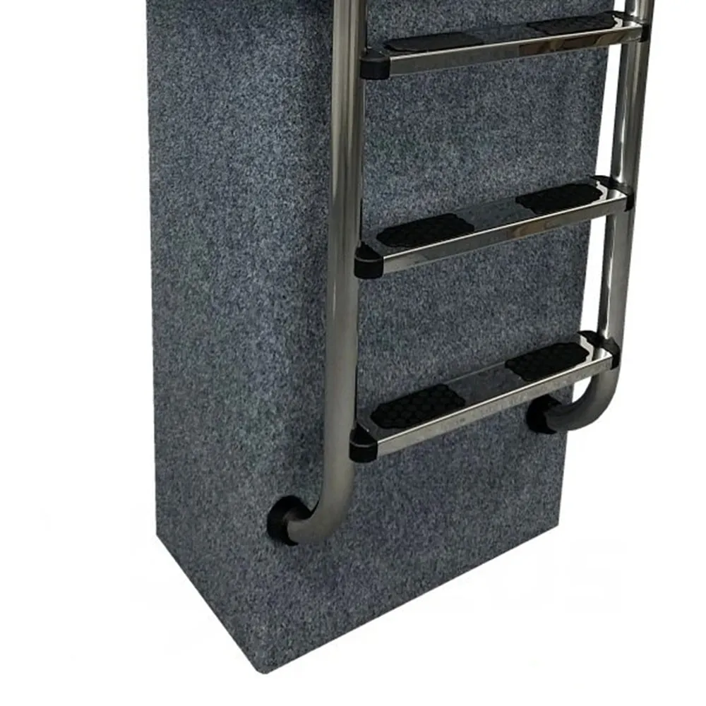 Celá konstrukce schůdků, včetně madel i jednotlivých stupňů, je vyrobena z kvalitní nerezové oceli AISI 304. Každý stupeň je osazen plastovým nášlapem s protiskluzovou úpravou, která zajišťuje bezpečný pohyb při vstupu i výstupu z bazénu.