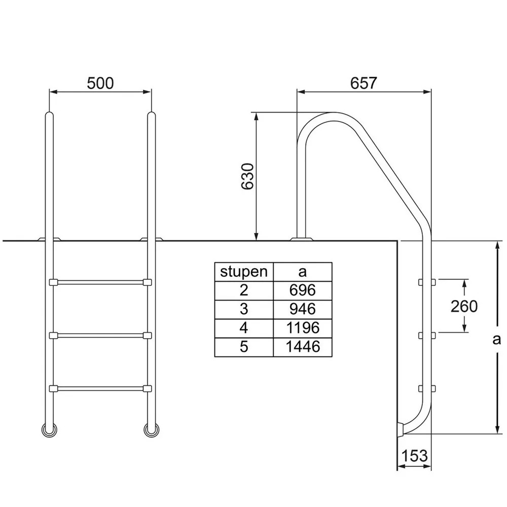 Bazénové schůdky z leštěné nerezové oceli AISI 304 jsou navrženy pro bezpečný a pohodlný vstup do zapuštěných bazénů se sladkou vodou o hloubce 100 – 130 cm.