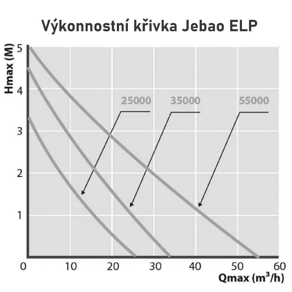 Velkoobjemové čerpadlo Jebao ELP je navrženo pro vysoký výkon, úsporný provoz a spolehlivost v náročných podmínkách. S průtokem 35000 l/h, výtlakem 4,5 m a příkonem 200 W je vhodné k oběhu vody, k přečerpávání vody z nádrží, pro zahradní potoky, do gravitačních systémů i ke zvýšení proudění vody