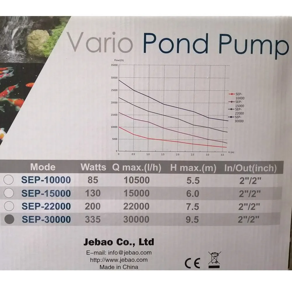 Jebao SEP 15000 je výkonné a přitom úsporné jezírkové čerpadlo s externí regulací průtoku, ideální pro filtrační systémy, potoky i vodopády. S průtokem až 15000 l/h, výtlakem 6 m a spotřebou pouhých 130 W nabízí velmi dobrý poměr výkonu a energetické úspory.