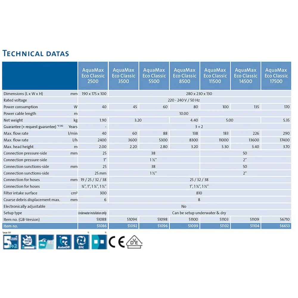 Čerpadla AquaMax Eco Classic vynikají velkým výkonem, extrémně nízkým příkonem, variabilitou použití a především velkou spolehlivostí.• Design čerpadla a kompaktní rozměry umožňují čerpadlo uložit do stísněných prostor, ve vodě je čerpadlo téměř neviditelné.
