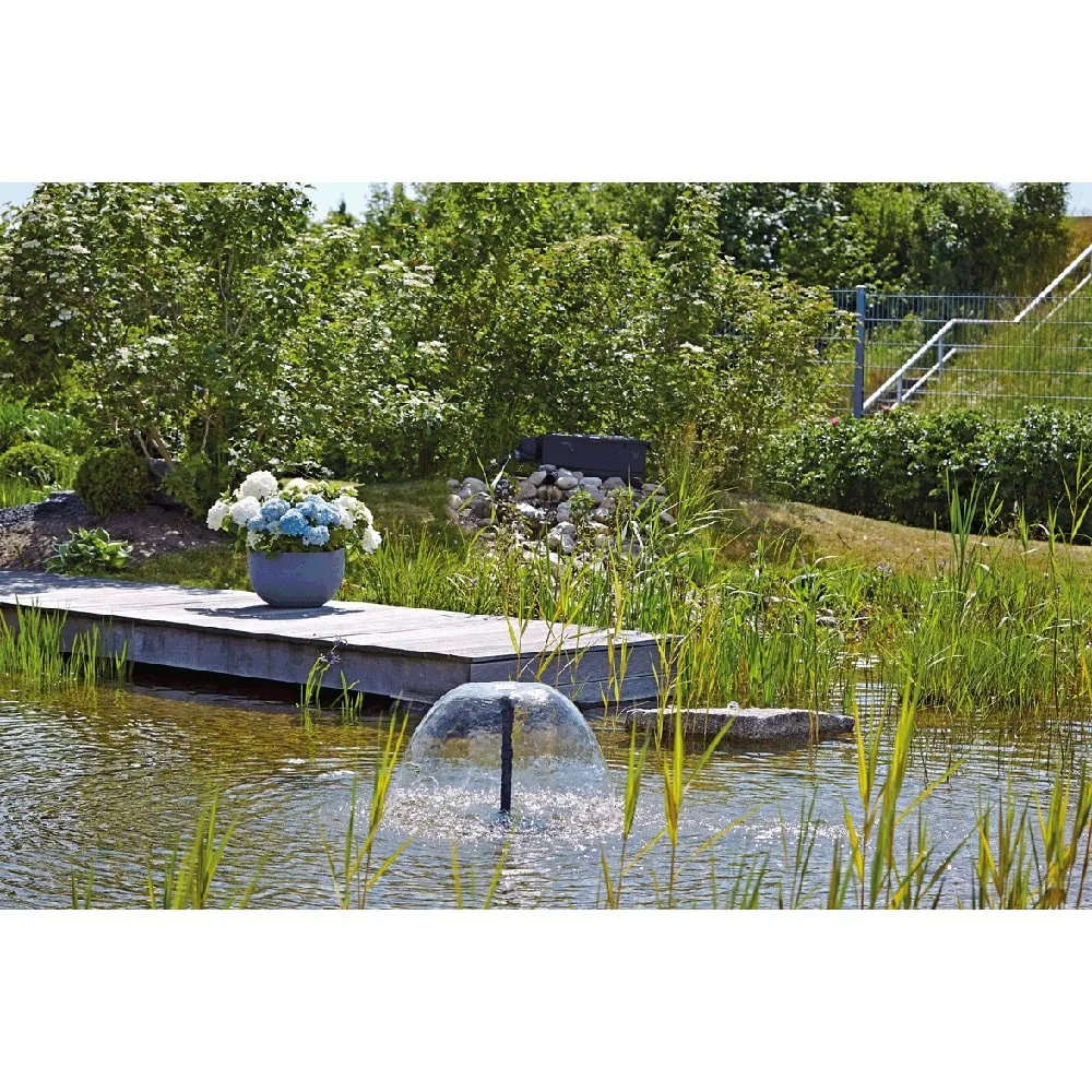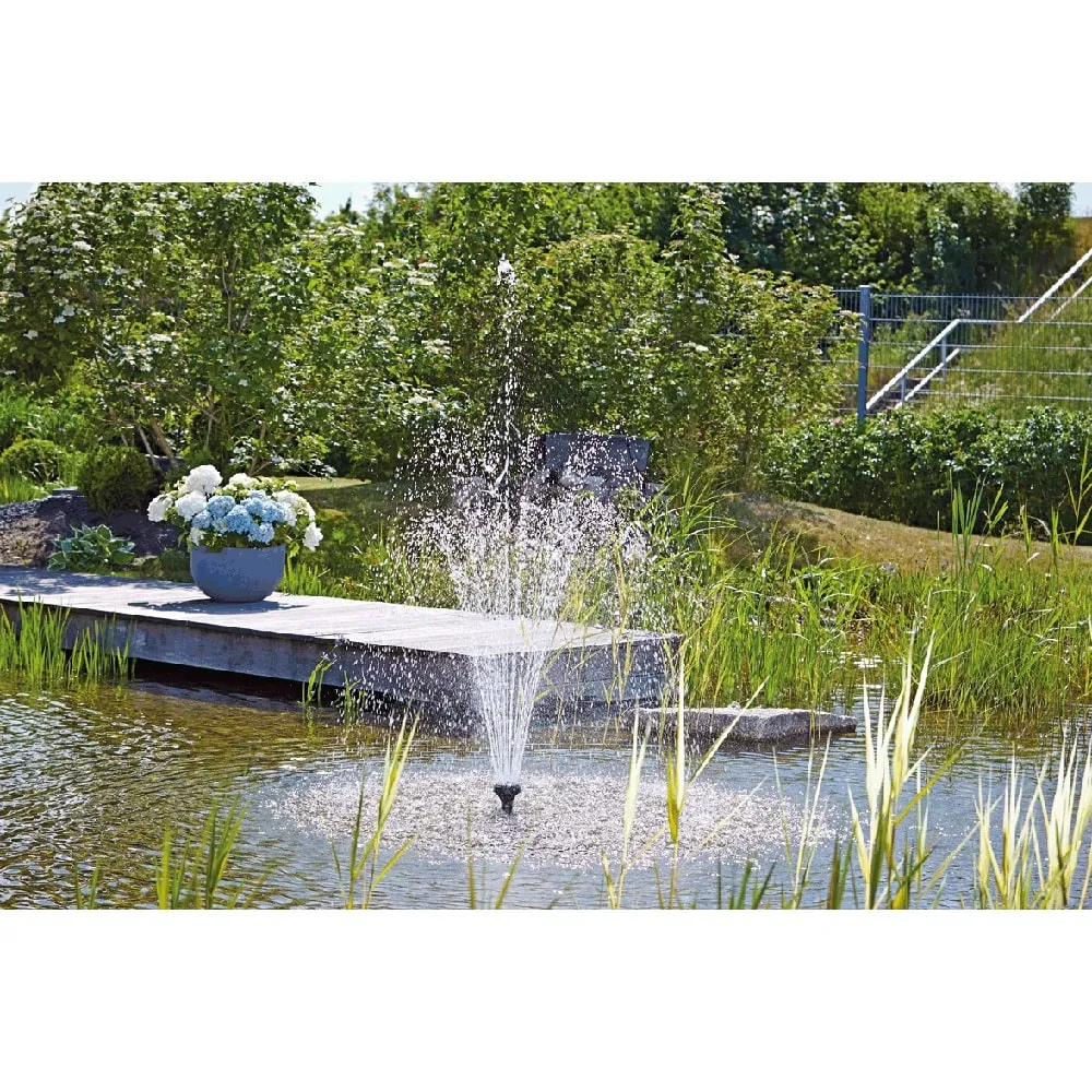 Přechodový díl s nerezovým jemným filtračním sítem zajišťuje účinnou filtraci jemných nečistot a rovnoměrný průtok. Díky teleskopickému prodloužení s integrovanou výkyvnou hlavou lze fontánu přesně nastavit podle potřeby. Patky čerpadla poskytují stabilní postavení v jezírku a snadnou manipulaci při instalaci.
