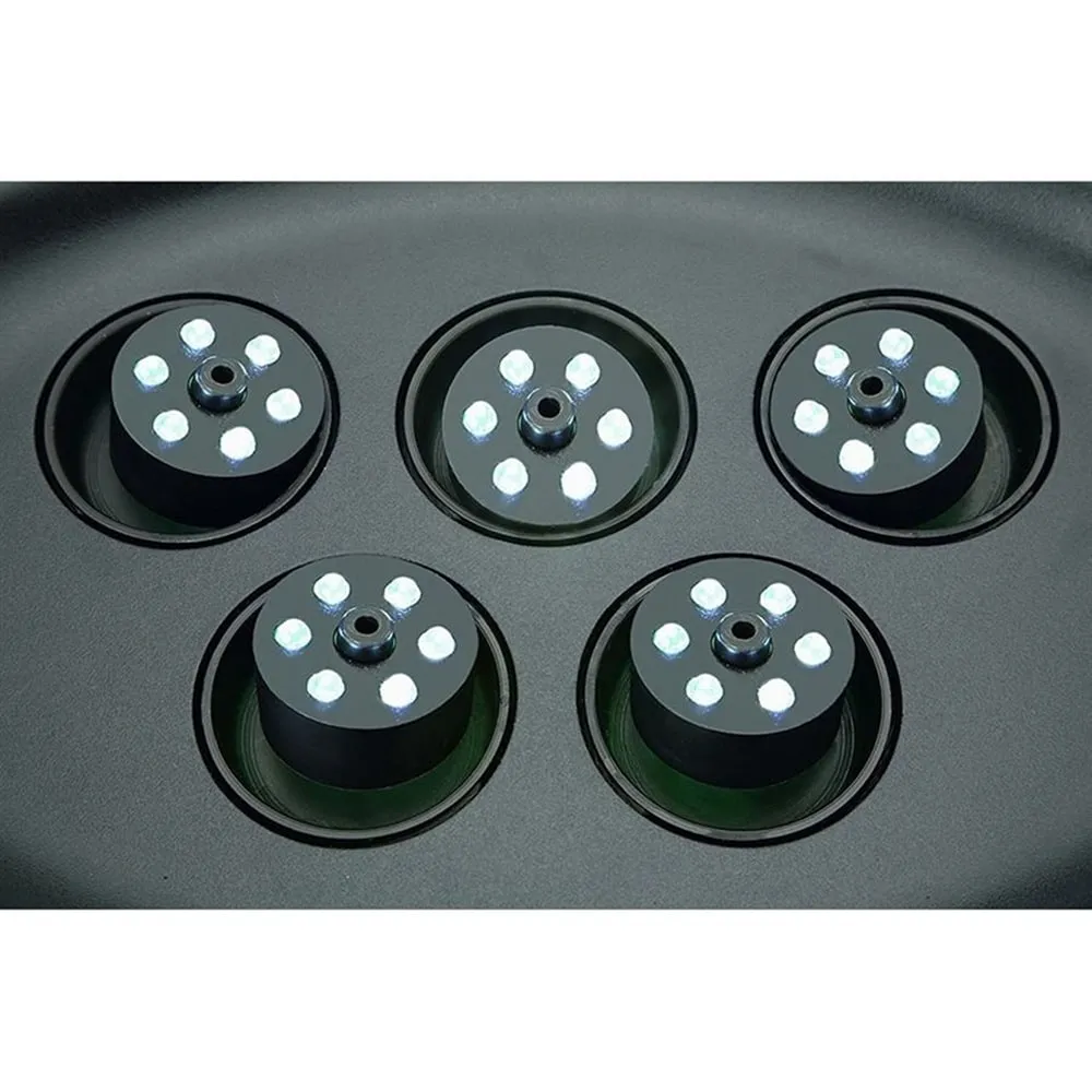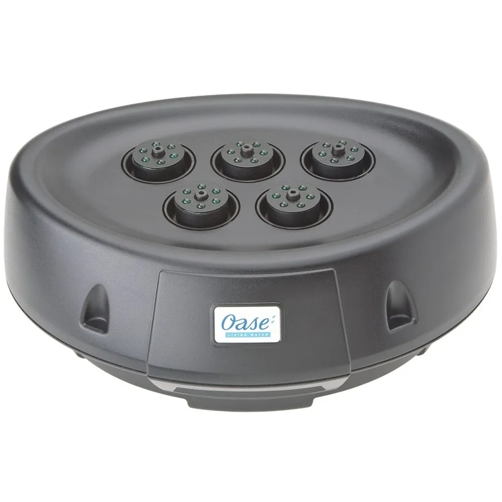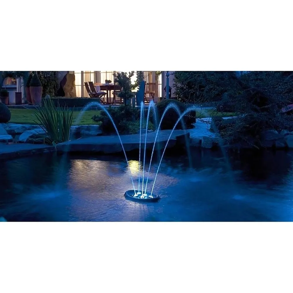 Fontánu lze umístit jako plovoucí prvek nebo ji stabilně usadit na dno jezírka. Robustní perforovaná základna zajišťuje stabilitu a chrání čerpadla před mechanickým poškozením. Výška výstřiku dosahuje až 70 cm a světelné prstence kolem trysek rovnoměrně osvěcují vodní proud bez rušivých stínů.