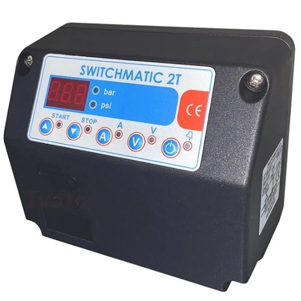 Elektronický tlakový spínač SWITCHMATIC 2T 400 V je zařízení určené k ovládání a ochraně třífázových čerpadel s příkonem až 4,4 kW. Díky integrovanému digitálnímu manometru umožňuje přesné nastavení zapínacího a vypínacího tlaku v rozmezí 0,5 až 12 barů a zároveň poskytuje spolehlivou ochranu čerpadla.