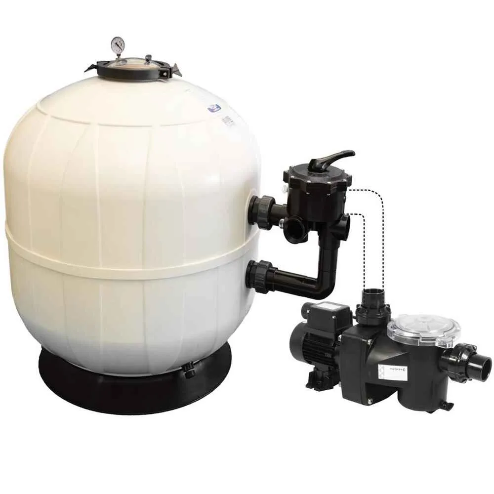 Součástí sestavy je výkonné čerpadlo FreeFlo 12, které zajišťuje maximální průtok 12 m³/h a bezproblémový chod i při vyšší zátěži. Boční 6cestný ventil umožňuje snadné přepínání mezi režimy filtrace, proplachu, recirkulace či vypouštění a výrazně usnadňuje údržbu.