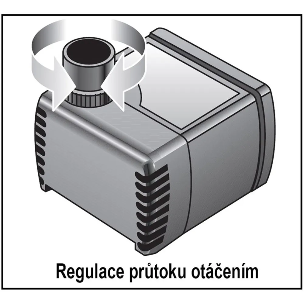 Průtok vody lze snadno upravit pomocí integrovaného regulátoru na těle čerpadla. Maximální výkon dosahuje 300 l/h s výtlakem až 0,7 metru. Čerpadlo je osazeno 13 mm zástrčným hrdlem pro připojení hadice a umožňuje pohodlnou montáž pomocí přiložených silikonových přísavek.