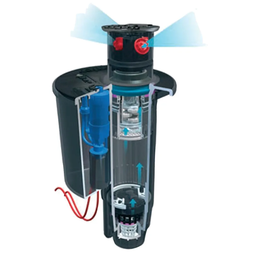 Postřikovač je vybaven integrovaným elektromagnetickým ventilem 24 V-AC, zabudovaným regulátorem tlaku a zabudovaným zpětným ventilem, který umožňuje zpracovat převýšení až 8 metrů bez nežádoucího odtékání vody.