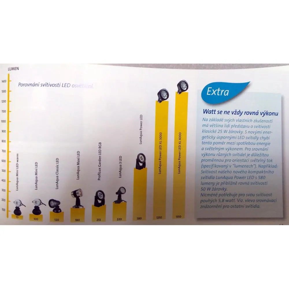 Oase LunAqua Power LED XL 4000 Wide Flood je nové, vysoce výkonné podvodní a zahradní LED osvětlení disponující ochranným krytím IP68 s bezpečným napětím 24 V od OASE. Robustní LED reflektor je vyroben z vysoce odolného plastu a je použitélný do zahrady i pod vodu. Při použití pod vodu jej lze instalovat do hloubky až 4 m.