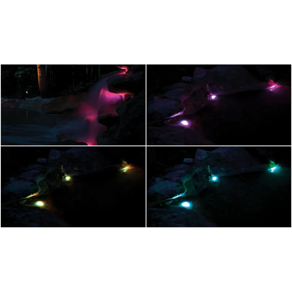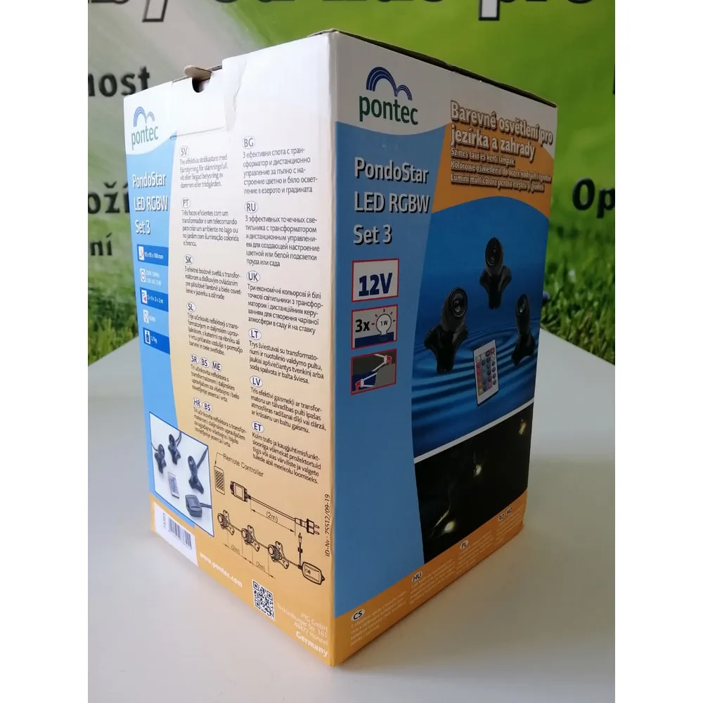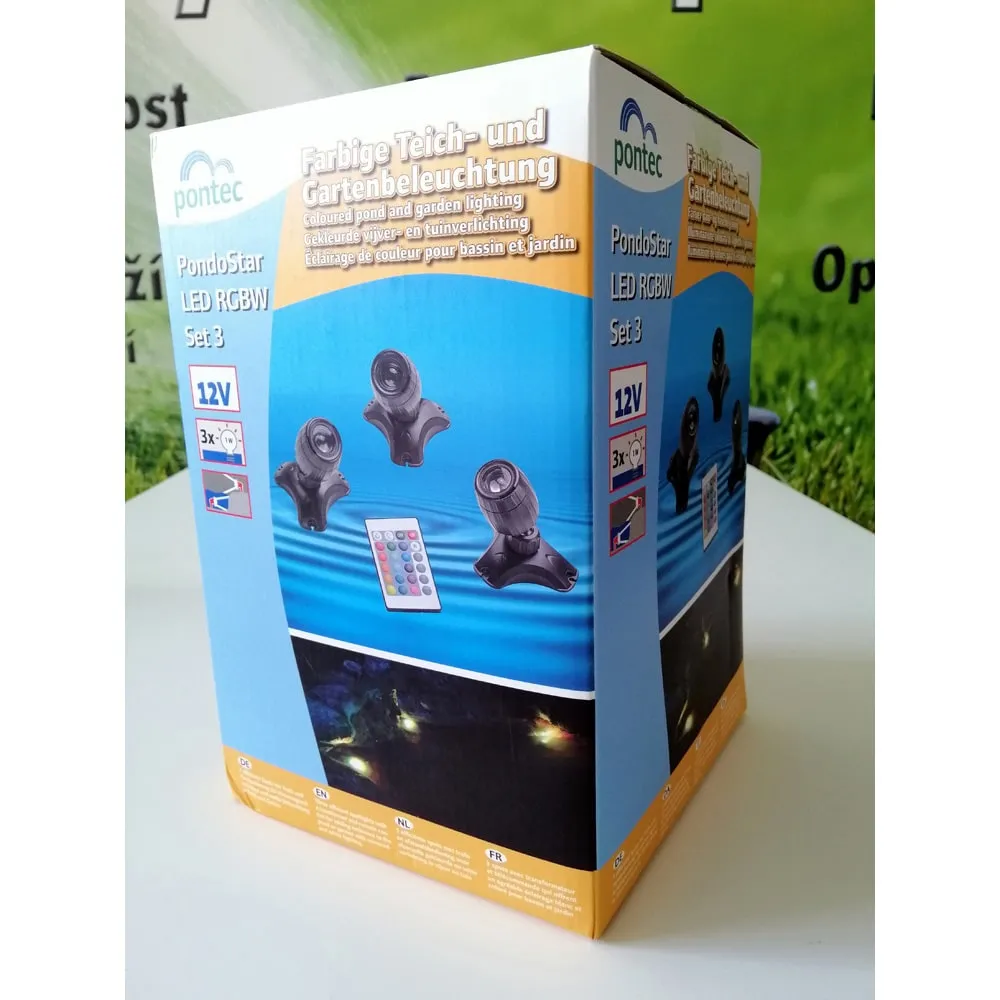 Pontec PondoStar LED RGBW Set 3 jedná se o set tří LED barevných reflektorů, které lze ovládat dálkově jsou použitelné pro zahradní okrasná i koupací jezírka, vodotrysky, rybníky, nádže apod. Jezírkové a zahradní osvětlení použitelné nad i pod vodou. Světla disponují ochranným krytím IP 68 a je možné je použít do hloubky až 1 m.RGBW - Pomocí dálkového ovládání si můžete navolit jakoukoli barvu a svit reflektorů.