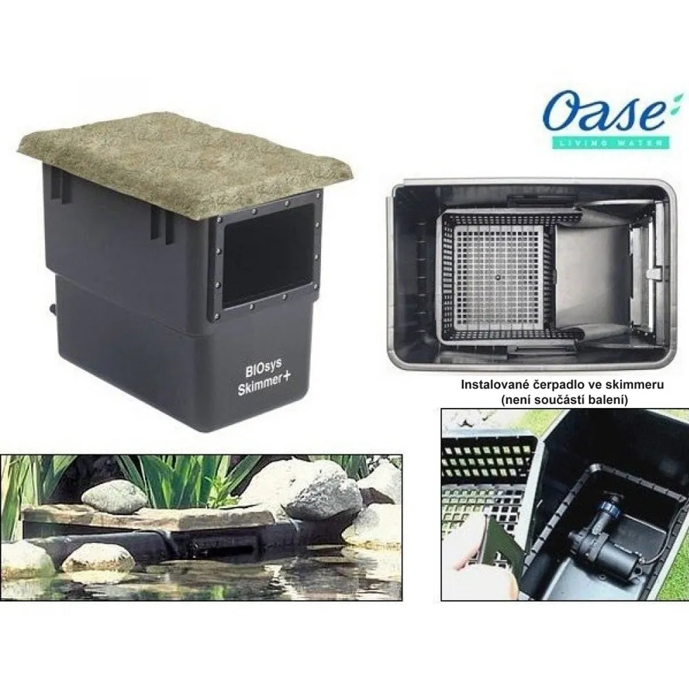 Boční skimmer OASE BioSys Skimmer Plus pro zahradní jezírka s plochou hladiny až 50 m2. Vhodný pro jezírka s větší možností znečištění. (spadem listí, atd.) automatické vyrovnání výkyvů hladiny až do 100 mm.