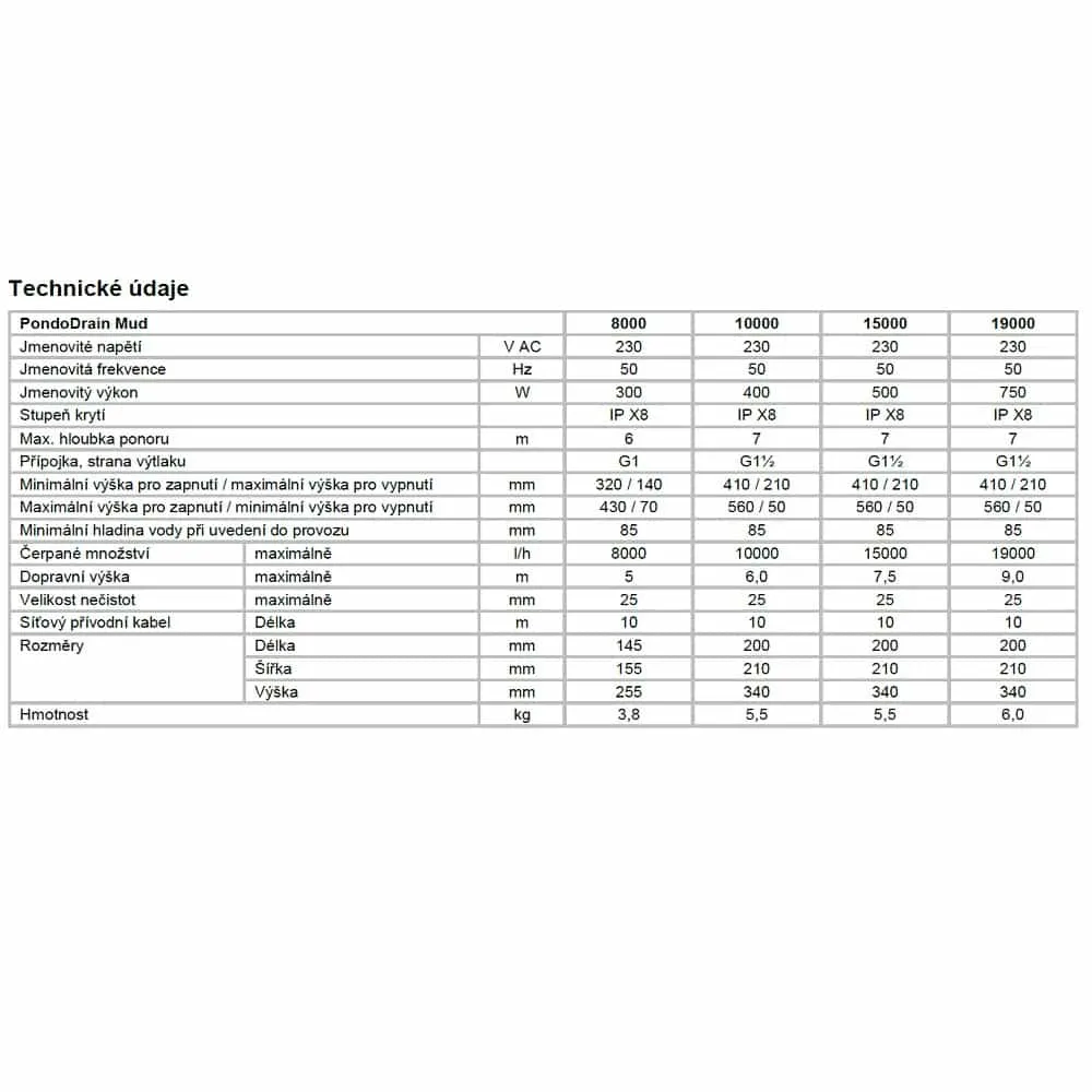 Model PondoDrain Mud 10000 pracuje s průtokem až 167 l/min, dosahuje výtlaku 6 metrů a je vybaven motorem o příkonu 400 W. Díky těmto parametrům je ideální pro efektivní odvodnění nebo přečerpávání vody z nízko položených míst.