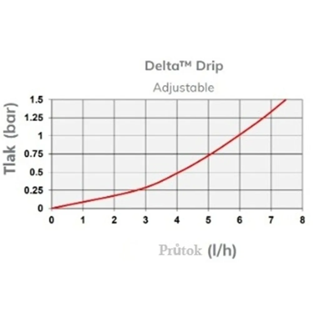 Kapkovač Delta Drip s hrotem je praktický zavlažovací prvek, který umožňuje přesnou a plně regulovatelnou distribuci vody přímo k rostlinám. Díky vestavěnému kohoutku lze průtok nastavit v rozmezí od 0 do 6 l/h při doporučeném tlaku 1 bar, případně jej zcela uzavřít. Stabilní zapichovací hrot zajišťuje pevnou instalaci přímo v zemině a pohodlné umístění ke kořenům rostlin.