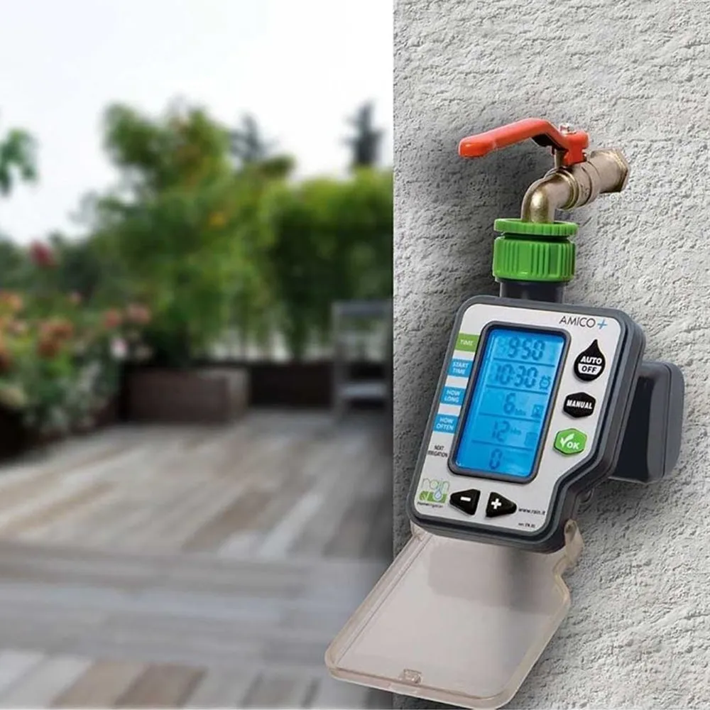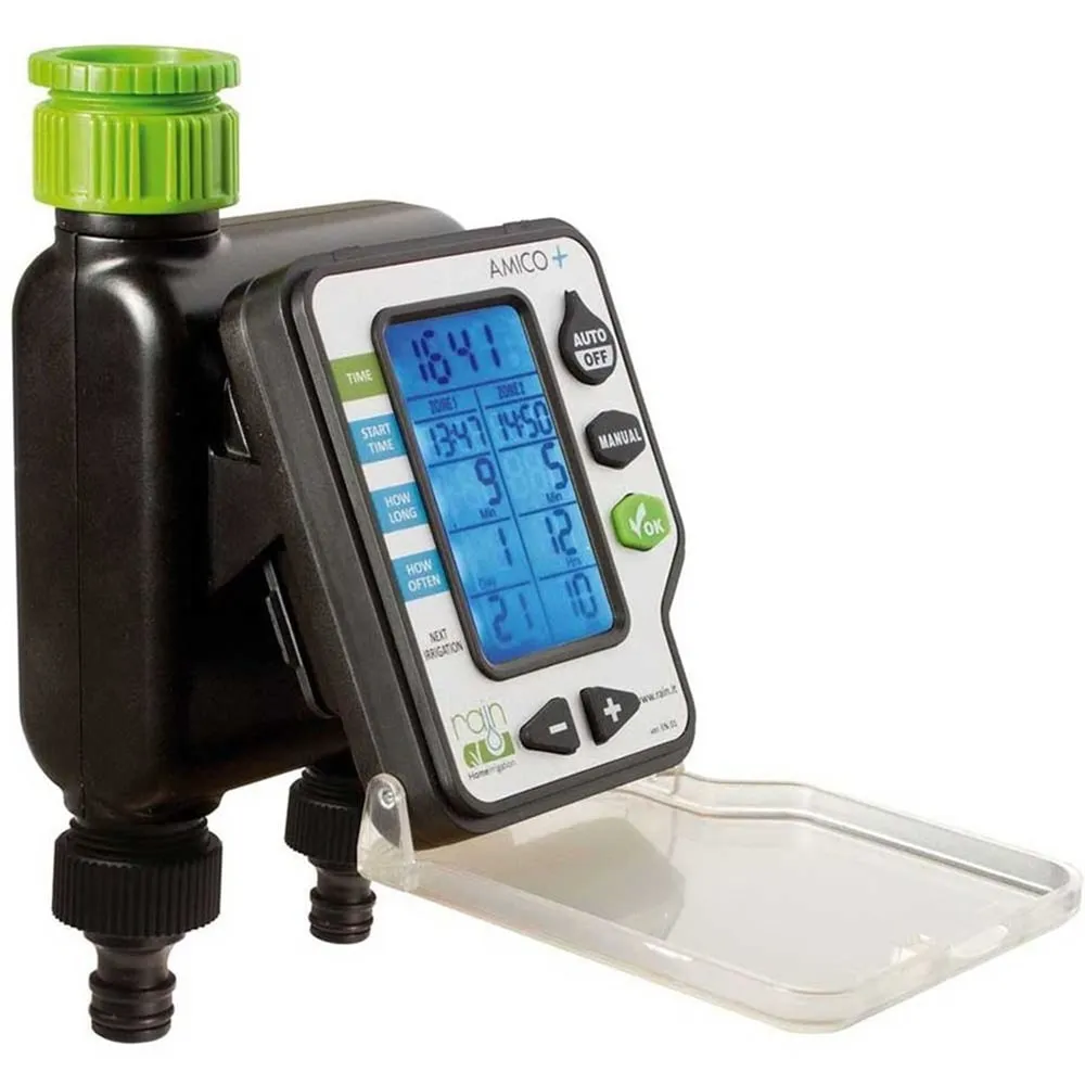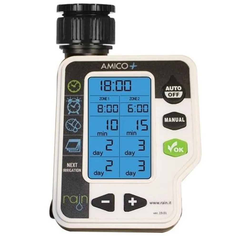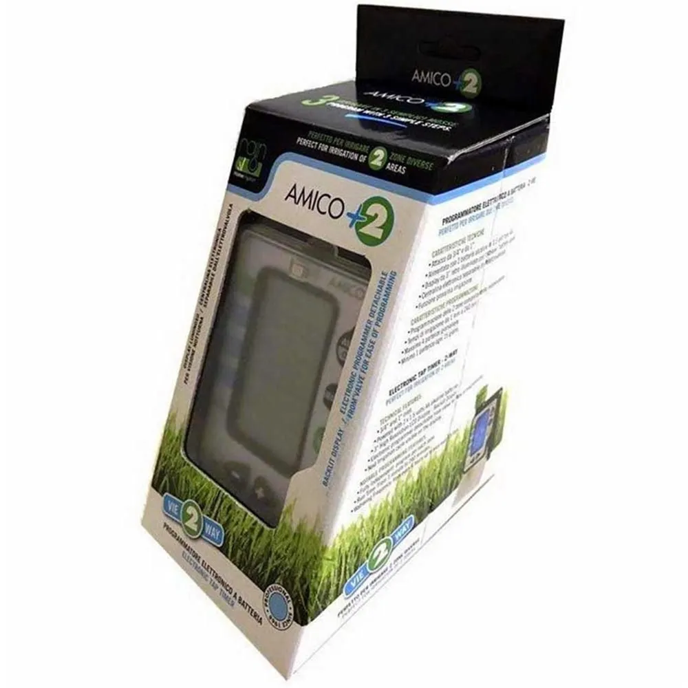 Rain AMICO+2 je bateriová řídicí jednotka určená pro ovládání dvou sekcí, ideální pro terasy, předzahrádky, truhlíky či vyvýšené záhony. Je vyrobena z odolného ABS plastu a díky vestavěnému filtračnímu sítku chrání systém před nečistotami. Díky elektromagnetickému ventilu a napájení ze dvou 1,5 V AA baterií funguje nezávisle na elektrické síti a snadno se instaluje přímo na zahradní kohoutek.