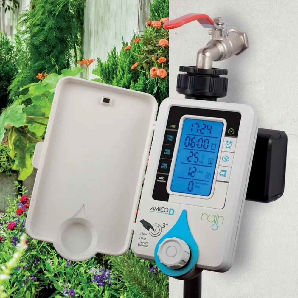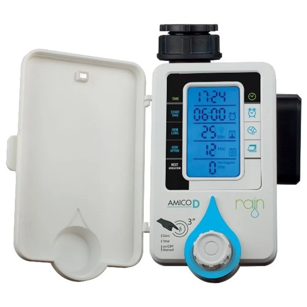Rain AMICO D1 je digitální řídicí jednotka určená pro ovládání jedné sekce, ideální pro menší zavlažovací systémy, jako jsou předzahrádky, terasy nebo vyvýšené záhony. Díky vestavěnému elektromagnetickému ventilu a napájení ze dvou 1,5 V AA baterií funguje nezávisle na elektrické síti a snadno se instaluje přímo na zahradní kohoutek.