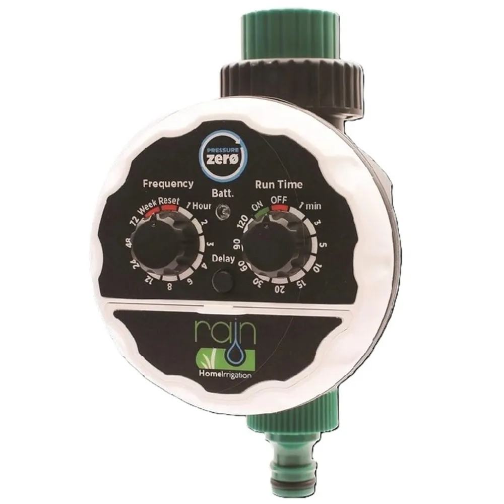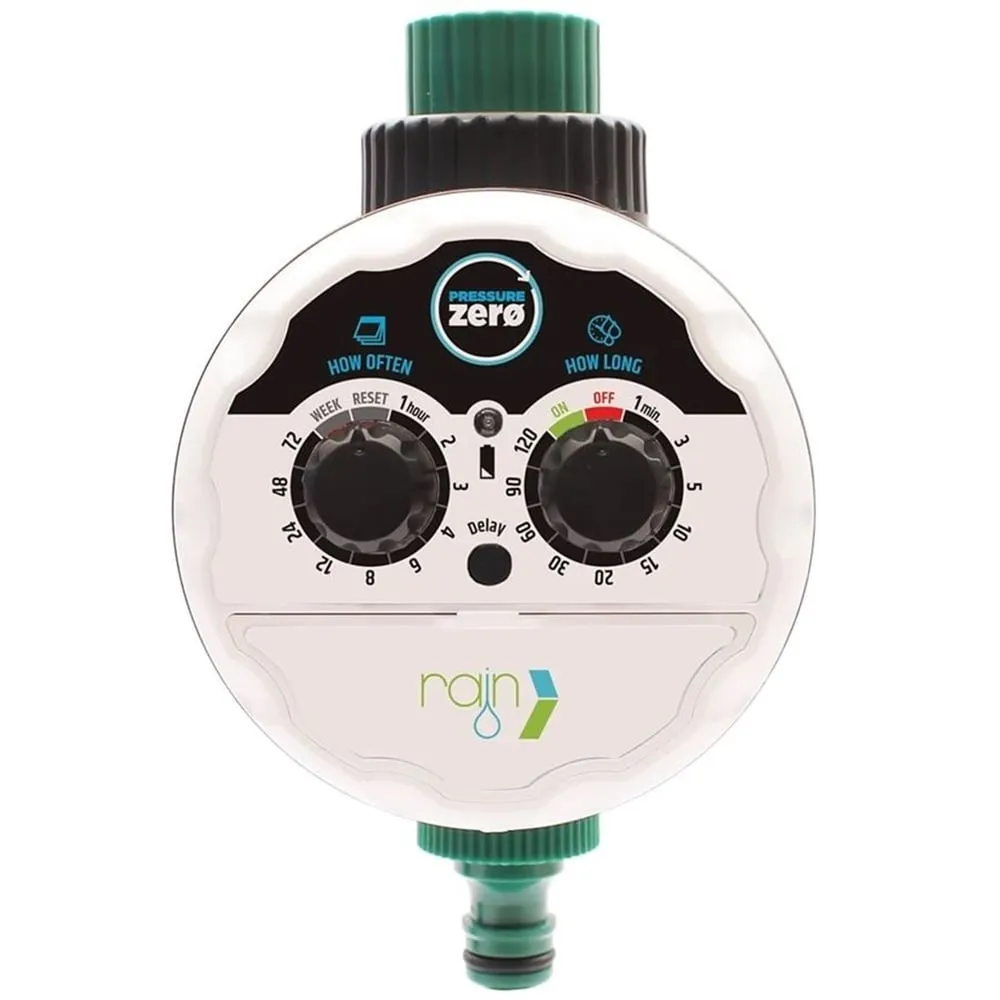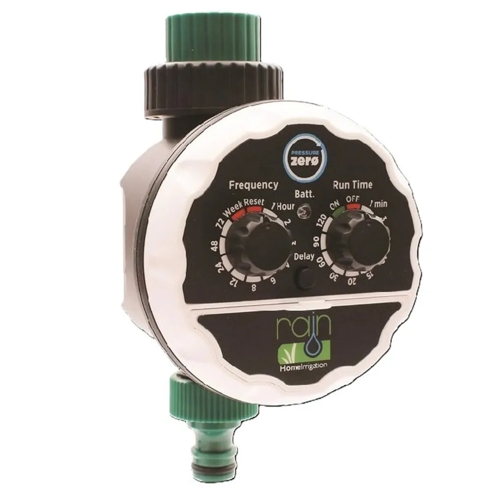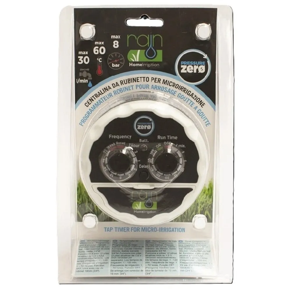 Rain Pressure ZERO je bateriová řídicí jednotka navržená pro automatizaci závlahy jedné sekce, ideální i pro systémy s nulovým tlakem. Díky tomu je perfektní volbou pro zavlažování samospádem z nádrží, sudů s dešťovou vodou nebo gravitační kapkovou závlahu.