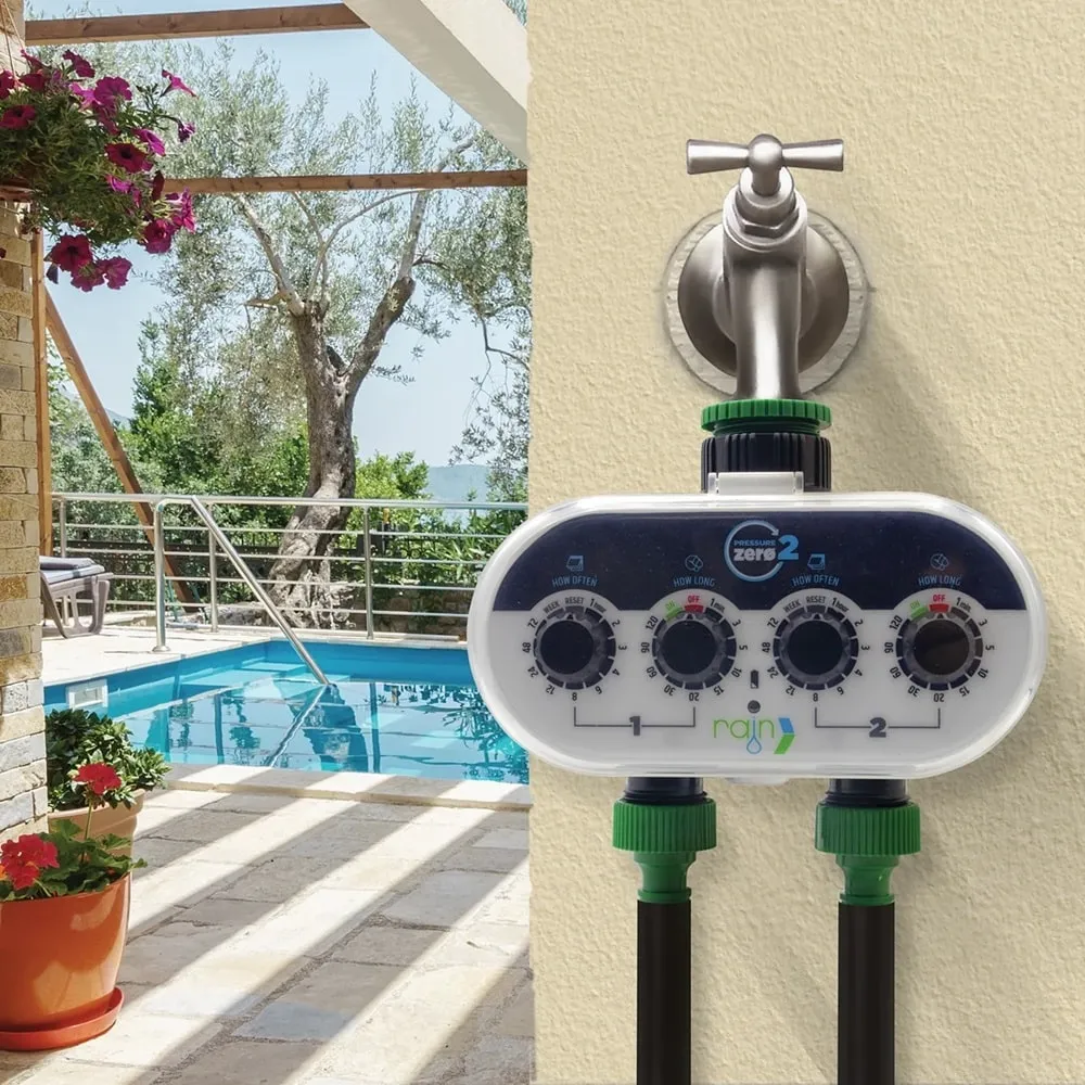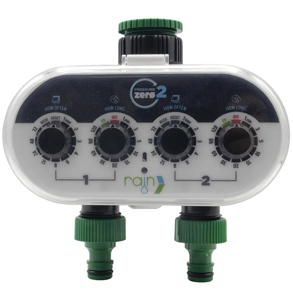 Rain Pressure ZERO je bateriová řídicí jednotka navržená pro automatizaci závlahy dvou sekcí, ideální i pro systémy s nulovým tlakem. Díky tomu je perfektní volbou pro zavlažování samospádem z nádrží, sudů s dešťovou vodou nebo gravitační kapkovou závlahu.
