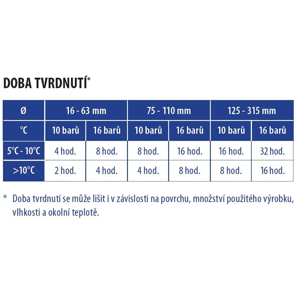 - Doba tvrdnutí závisí na velikosti potrubí, okolní teplotě a vlhkosti, standardně 12 hodin pro zaschnutí, doporučeno 24 hodin pro maximální pevnost.