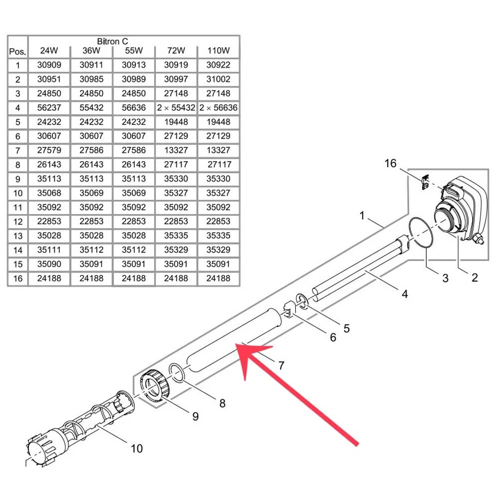 Délka 29,8 cm, průměr 4,5 / 4,1 cm, pro UV lampy Oase Bitron 18C a 24C.
