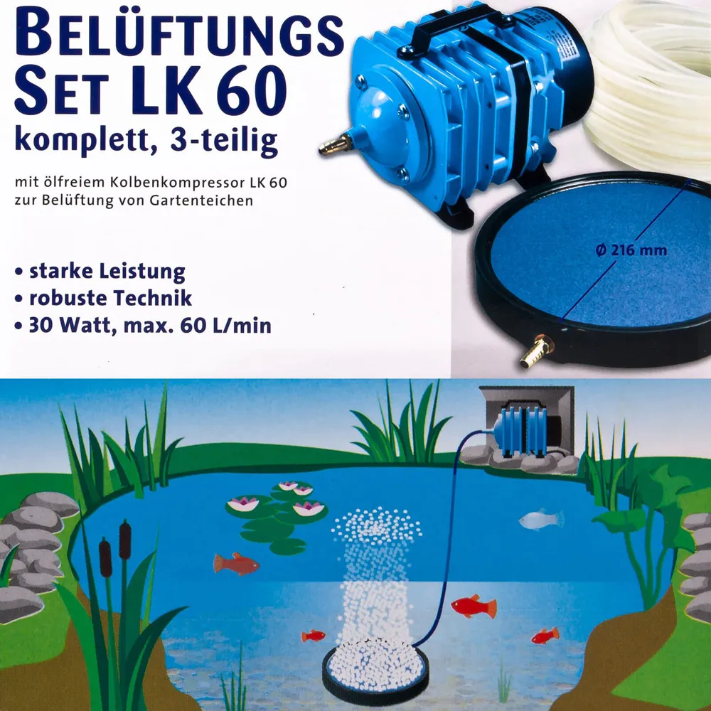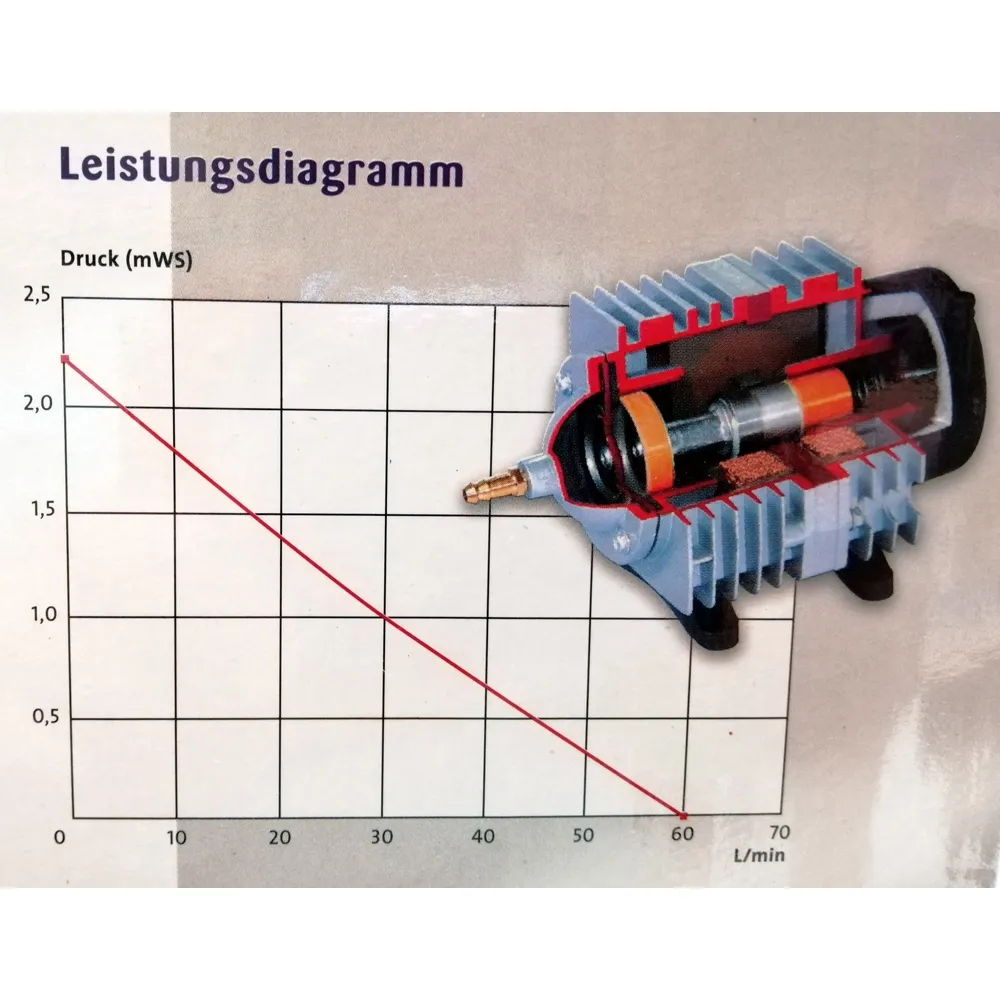 Výkonný, energeticky úsporný kompresor disponuje hliníkovým pouzdrem a je odolný proti stříkající vodě. Instalace je tedy možná ve venkovním prostředí. Kompresor LK-60 zajišťuje vysoký tlak a tím i flexibilní hloubku ponoru vzduchovacích kamenů (Max. 1,8 metry - 0,018 MPa *).
