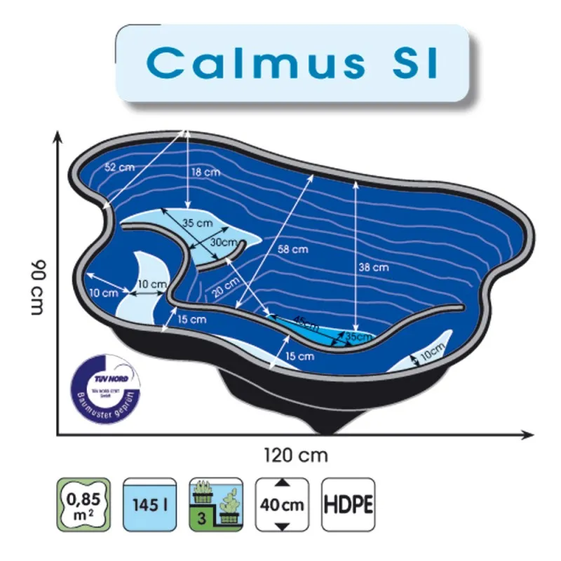 Plastové jezírko Calmus SI objemu 145. S ohledem na jednoduchou montáž je plastové jezírko vhodným způsobem ke snadnému vybudování vodního prvku v zahradě. Plastovou konstrukci jezírka jednoduše zapustíme do země. Pozor! Skrze objem zboží umíme poslat pouze prostřednictvím České pošty.Konstrukce:• Konstrukce jezírka je mrazuvzdorná a odolná proti UV záření.
