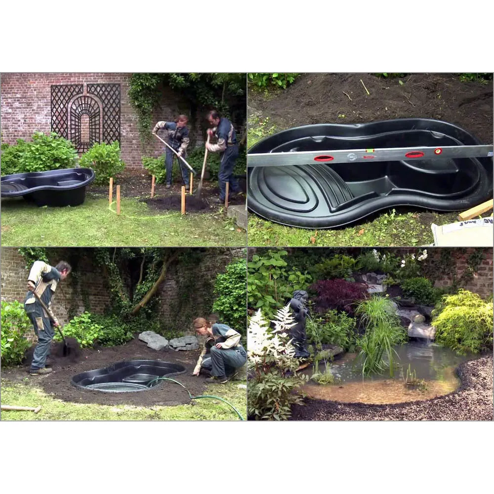 Usazení jezírka v jednoduchých krocích:• Podle tvaru jezírka vykopeme jámu, kterou zvětšíme o cca 10 cm v celém tvaru.  Pro dlouhou a bezproblémovou funkci a životnost se snažíme výkop provést co nejpřesněji.