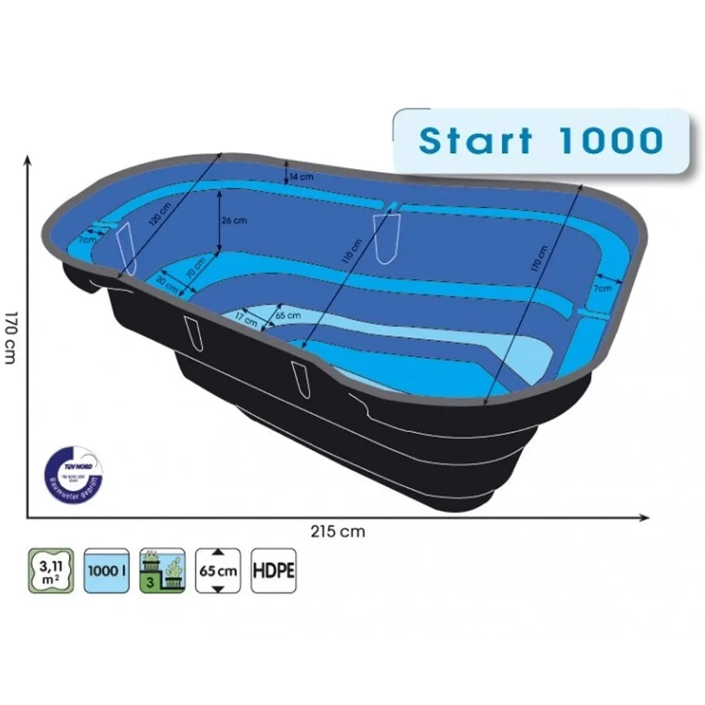 Doprava bude přičtena po přijetí objednávky (z tohoto důvodu není možné provést platbu kartou online), následně nutná úhrada předem.Plastové jezírko Ubbink Start 1000 o objemu 1000 l. S ohledem na jednoduchou montáž je plastové jezírko vhodným způsobem ke snadnému vybudování vodního prvku v zahradě. Plastovou konstrukci jezírka jednoduše zapustíme do země. Konstrukce:• Konstrukce jezírka je mrazuvzdorná a odolná proti UV záření.