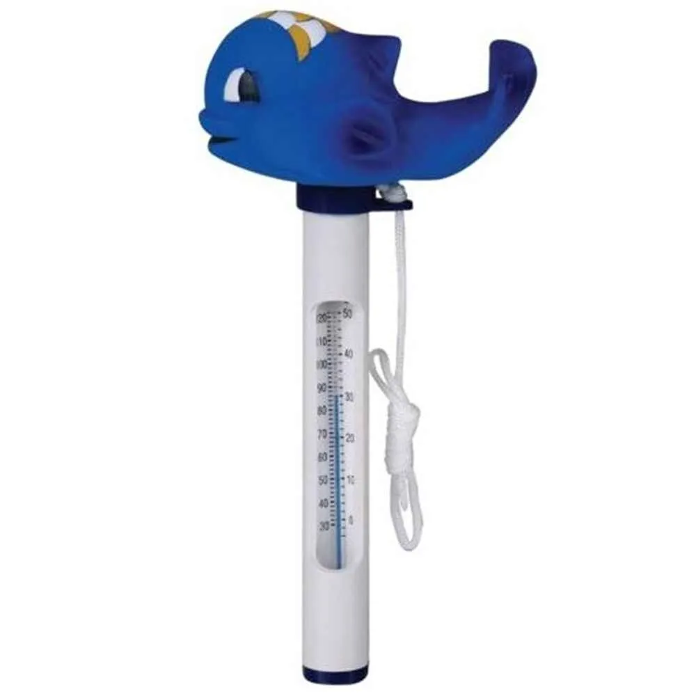 Plovoucí bazénový teploměr s plovákem ve tvaru delfína. Měří teplotu vody od -10 do +50 °C a lze jej upevnit šňůrkou.