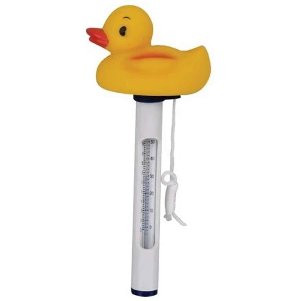 Plovoucí bazénový teploměr s plovákem ve tvaru kachny. Měří teplotu vody od -10 do +50 °C a lze jej upevnit šňůrkou.