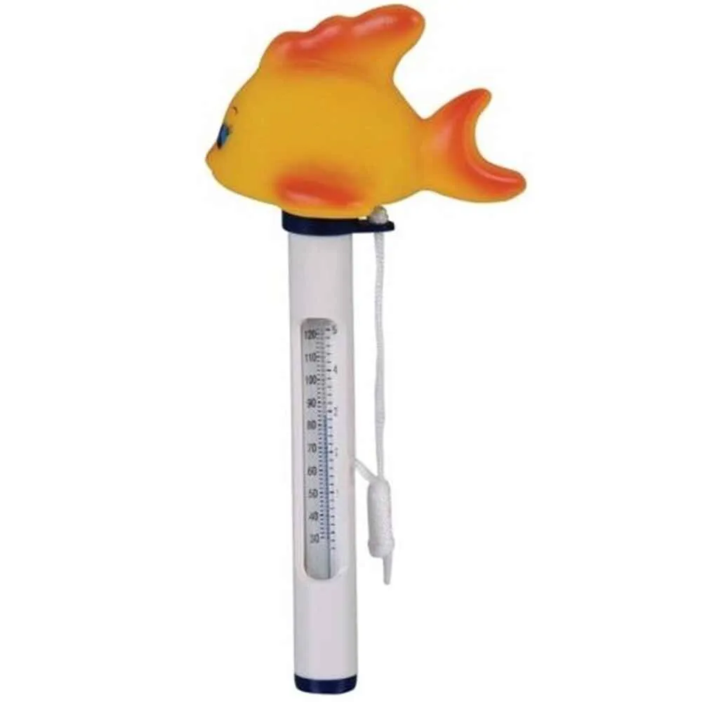 Plovoucí bazénový teploměr s plovákem ve tvaru rybky. Měří teplotu vody od -10 do +50 °C a lze jej upevnit šňůrkou.