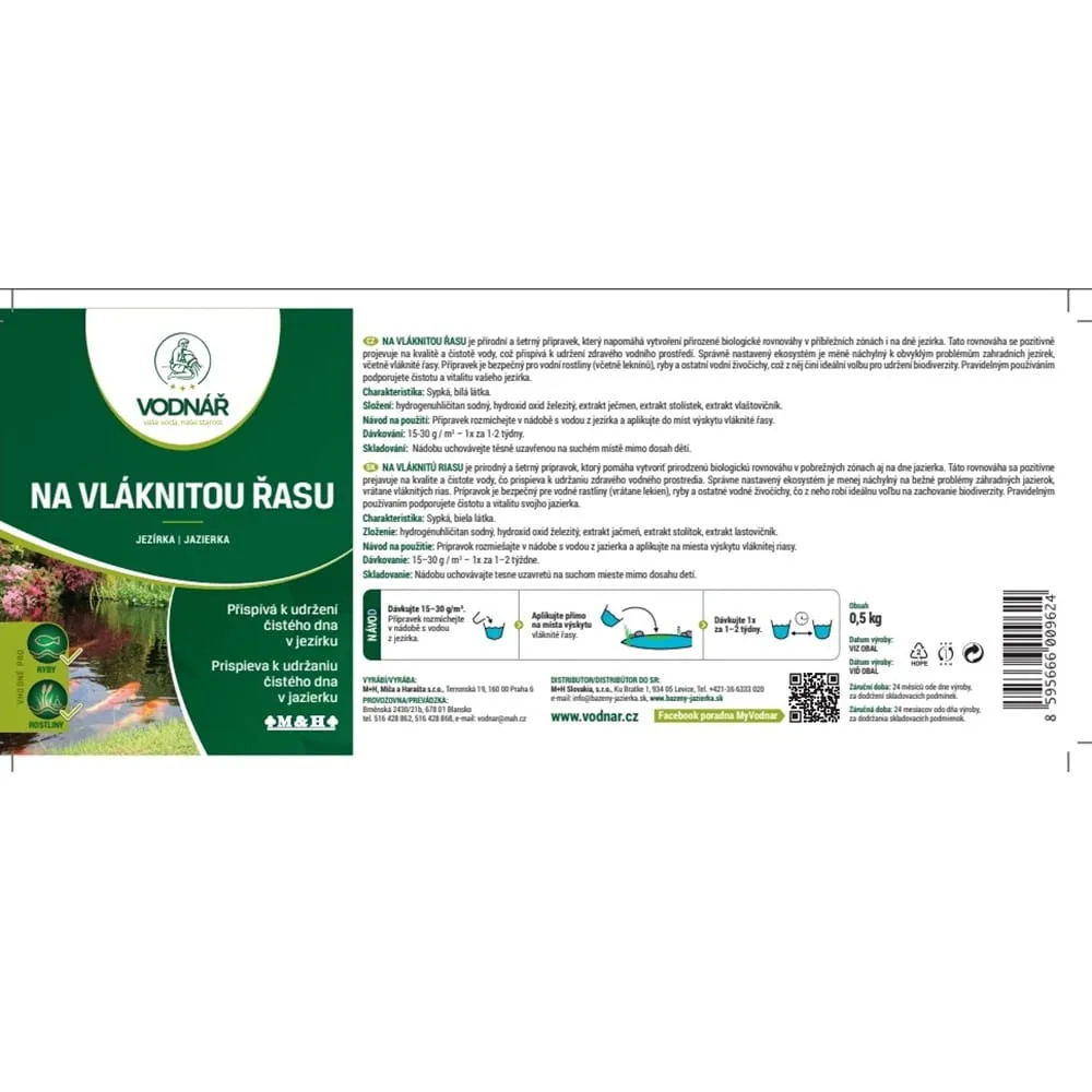 Dávkujte 15 až 30 g na 1 m³ vody jednou za 1 – 2 týdny. Přípravek nejprve rozmíchejte v nádobě s vodou z jezírka a poté aplikujte přímo do míst výskytu vláknité řasy.
