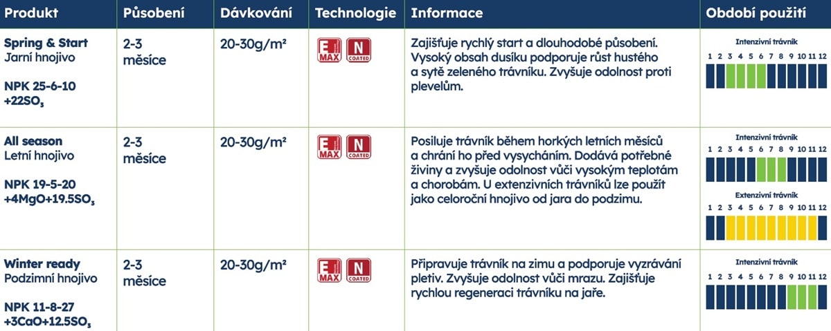 Díky technologii E-Max se živiny uvolňují postupně, což umožňuje dlouhodobou výživu bez rizika přehnojení. Hnojivo je ideální pro všechny typy trávníků a jeho účinek trvá až 3 měsíce.