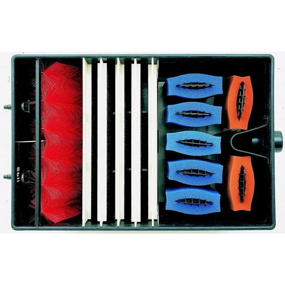 Za kartáči je umístěno pět rohoží pro další mechanické čištění - Sada 10 modrých a 4 červených filtračních hub