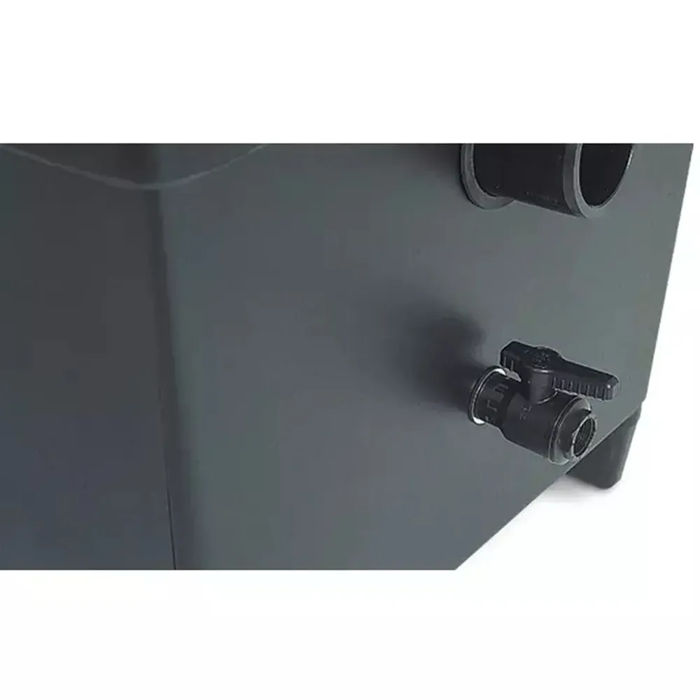 Tělo filtru je vyrobeno ze sklolaminátu, který je pevný, odolný a vhodný pro dlouhodobý provoz. Díky podlahové výpusti lze filtr snadno propláchnout. Filtr je navržen pro trvalý provoz a stabilní výkon i v náročných jezírkových systémech.