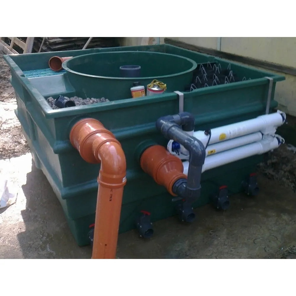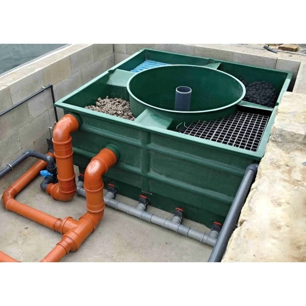 Filtr lze zapojit jako gravitační nebo čerpadlový systém. Vstup i výstup vody jsou umístěny na jedné straně filtru, což usnadňuje montáž i obsluhu. Spodní potrubí slouží pro přívod vody do filtru, horním výstupem se vyčištěná voda vrací zpět do jezírka.