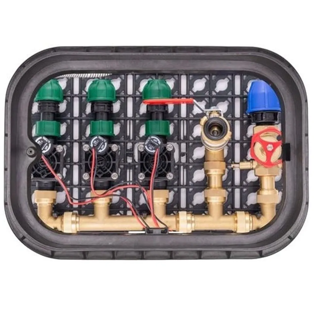 O distribuci vody se stará mosazný holendrový rozdělovač a jako hlavní uzávěr je integrován 1" sedlový ventil s odvodněním. Hydrant s 1" pákovým ventilem a Geka koncovkou slouží jako zdroj vody nebo připojení pro kompresor při zazimování. Součástí balení jsou také tři elektromagnetické ventily Hunter PGV-101-MM-B 9 V/DC, které ovládají automatické řízení průtoku vody v jednotlivých sekcích závlahy.