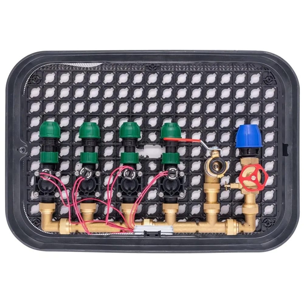 O distribuci vody se stará mosazný holendrový rozdělovač a jako hlavní uzávěr je integrován 1" sedlový ventil s odvodněním. Hydrant s 1" pákovým ventilem a Geka koncovkou slouží jako zdroj vody nebo připojení pro kompresor při zazimování. Součástí balení jsou také čtyři elektromagnetické ventily Hunter PGV-100MM-B 24 V/AC, které ovládají automatické řízení průtoku vody v jednotlivých sekcích závlahy.