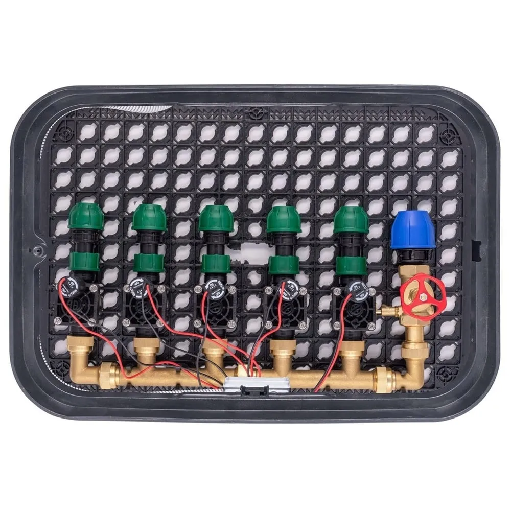 O distribuci vody se stará mosazný holendrový rozdělovač a jako hlavní uzávěr je integrován 1" sedlový ventil s odvodněním. Součástí balení je také pět elektromagnetických ventilů Hunter PGV-101-MM-B 9 V/DC, které ovládají automatické řízení průtoku vody v jednotlivých sekcích závlahy.