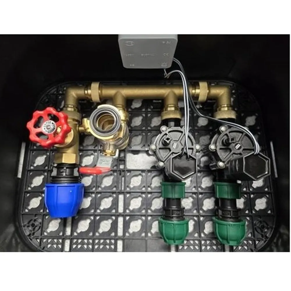 O distribuci vody se stará mosazný holendrový rozdělovač a jako hlavní uzávěr je integrován 1" sedlový ventil s odvodněním. Hydrant s 1" pákovým ventilem a Geka koncovkou slouží jako zdroj vody nebo připojení pro kompresor při zazimování. Součástí balení jsou také dva elektromagnetické ventily Rain Bird 100-DV-MM 24 V/AC, které ovládají automatické řízení průtoku vody v jednotlivých sekcích závlahy.