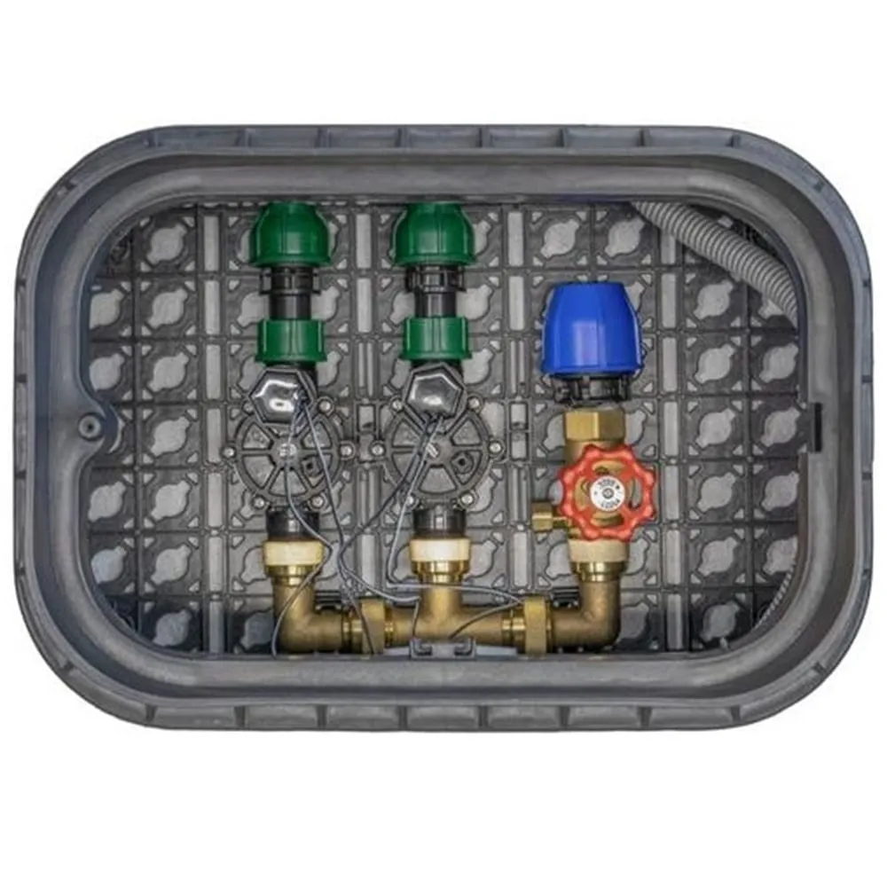 O distribuci vody se stará mosazný holendrový rozdělovač a jako hlavní uzávěr je integrován 1" sedlový ventil s odvodněním. Součástí balení jsou také dva elektromagnetické ventily Rain Bird 100-DV-MM 24 V/AC, které ovládají automatické řízení průtoku vody v jednotlivých sekcích závlahy.