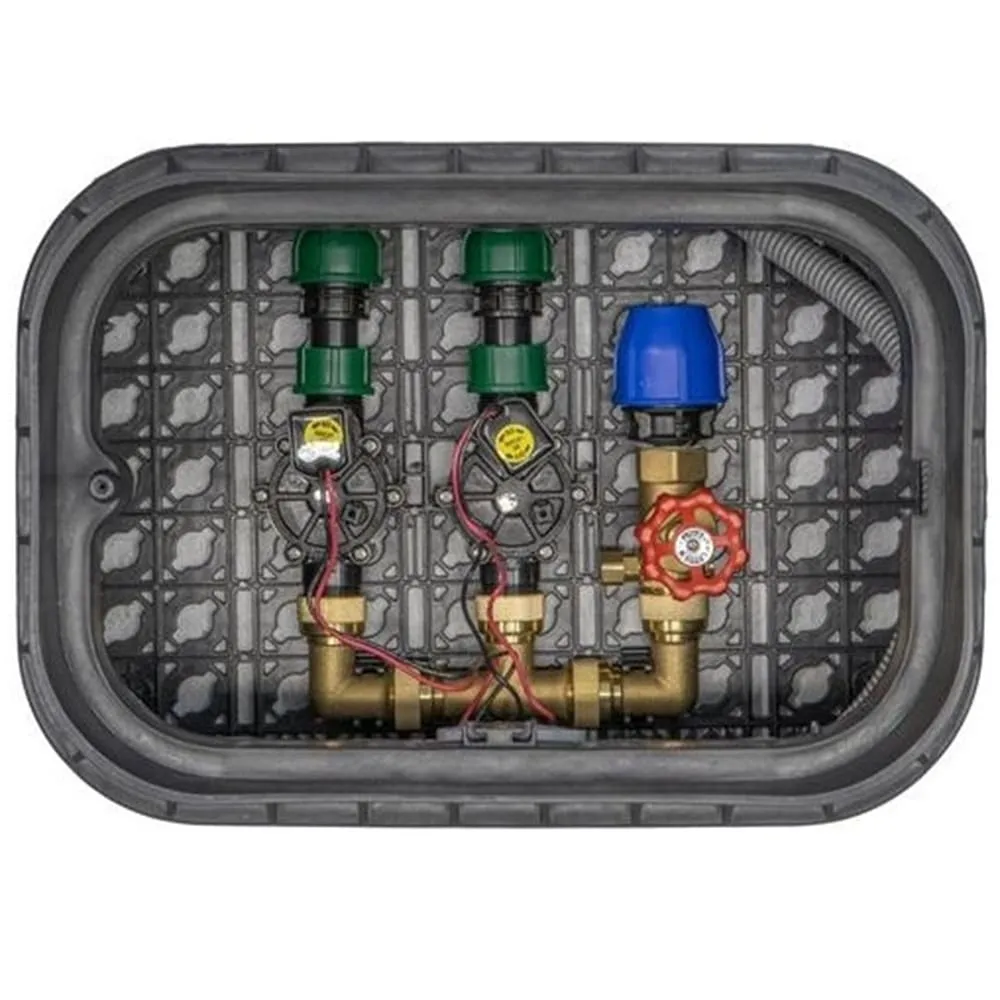 O distribuci vody se stará mosazný holendrový rozdělovač a jako hlavní uzávěr je integrován 1" sedlový ventil s odvodněním. Součástí balení jsou také dva elektromagnetické ventily Rain Bird 100-DV-MM 9 V/DC, které ovládají automatické řízení průtoku vody v jednotlivých sekcích závlahy.