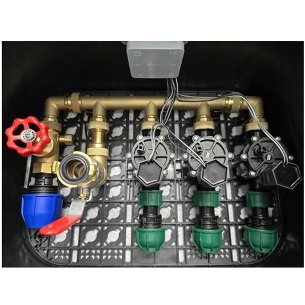 O distribuci vody se stará mosazný holendrový rozdělovač a jako hlavní uzávěr je integrován 1" sedlový ventil s odvodněním. Hydrant s 1" pákovým ventilem a Geka koncovkou slouží jako zdroj vody nebo připojení pro kompresor při zazimování. Součástí balení jsou také tři elektromagnetické ventily Rain Bird 100-DV-MM 24 V/AC, které ovládají automatické řízení průtoku vody v jednotlivých sekcích závlahy.