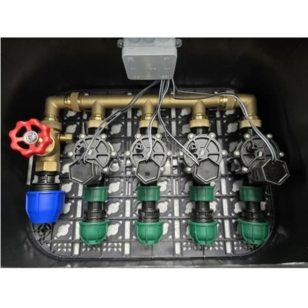 O distribuci vody se stará mosazný holendrový rozdělovač a jako hlavní uzávěr je integrován 1" sedlový ventil s odvodněním. Součástí balení jsou také čtyři elektromagnetické ventily Rain Bird 100-DV-MM 24 V/AC, které ovládají automatické řízení průtoku vody v jednotlivých sekcích závlahy.